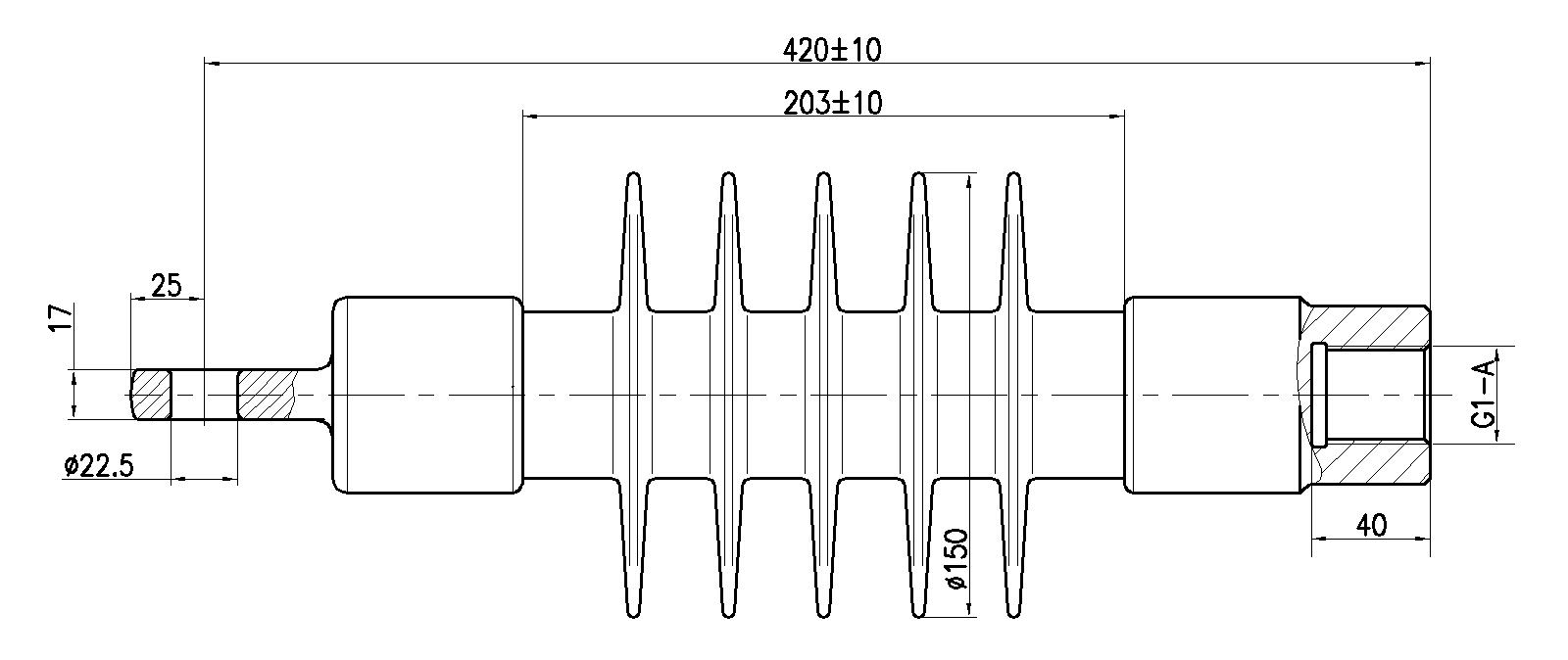 Примечание: НПО Изолятор постоянно работает над улучшением конструкции и повышением надежности изоляторов, в связи с чем, внешний вид защитной оболочки изолятора может отличаться от приведенного на рисунке, без изменения габаритных и присоединительных размеров изолятора.