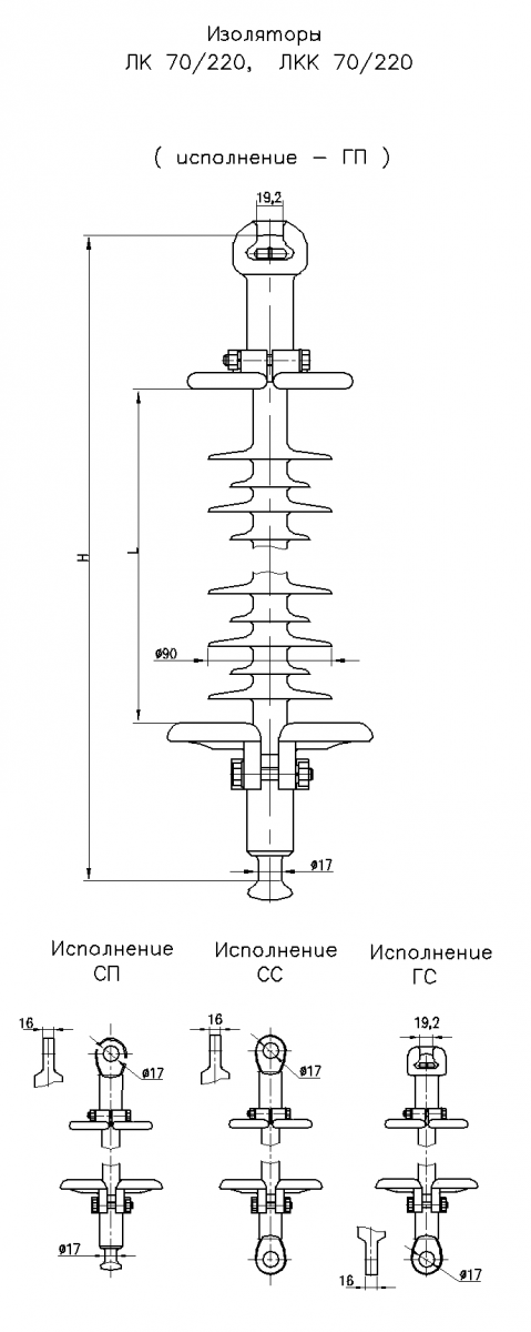 Изоляторы выпускаются в четырех исполнениях по типам применяемых оконцевателей: СП, ГП, ГС, СС. По специальному заказу возможны другие исполнения оконцевателей.