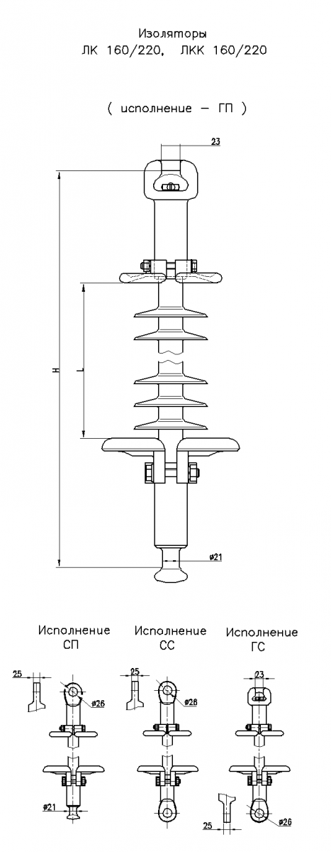 Изоляторы выпускаются в четырех исполнениях по типам применяемых оконцевателей: СП, ГП, ГС, СС. По специальному заказу возможны другие исполнения оконцевателей.