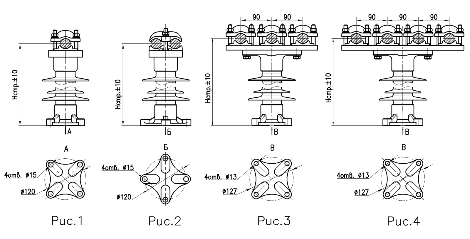 Примечание к рисункам: нижние фланцы шинных опор могут быть повернуты на 45° относительно показанных на рисунках. Обозначение таких шинных опор см. внизу страницы.