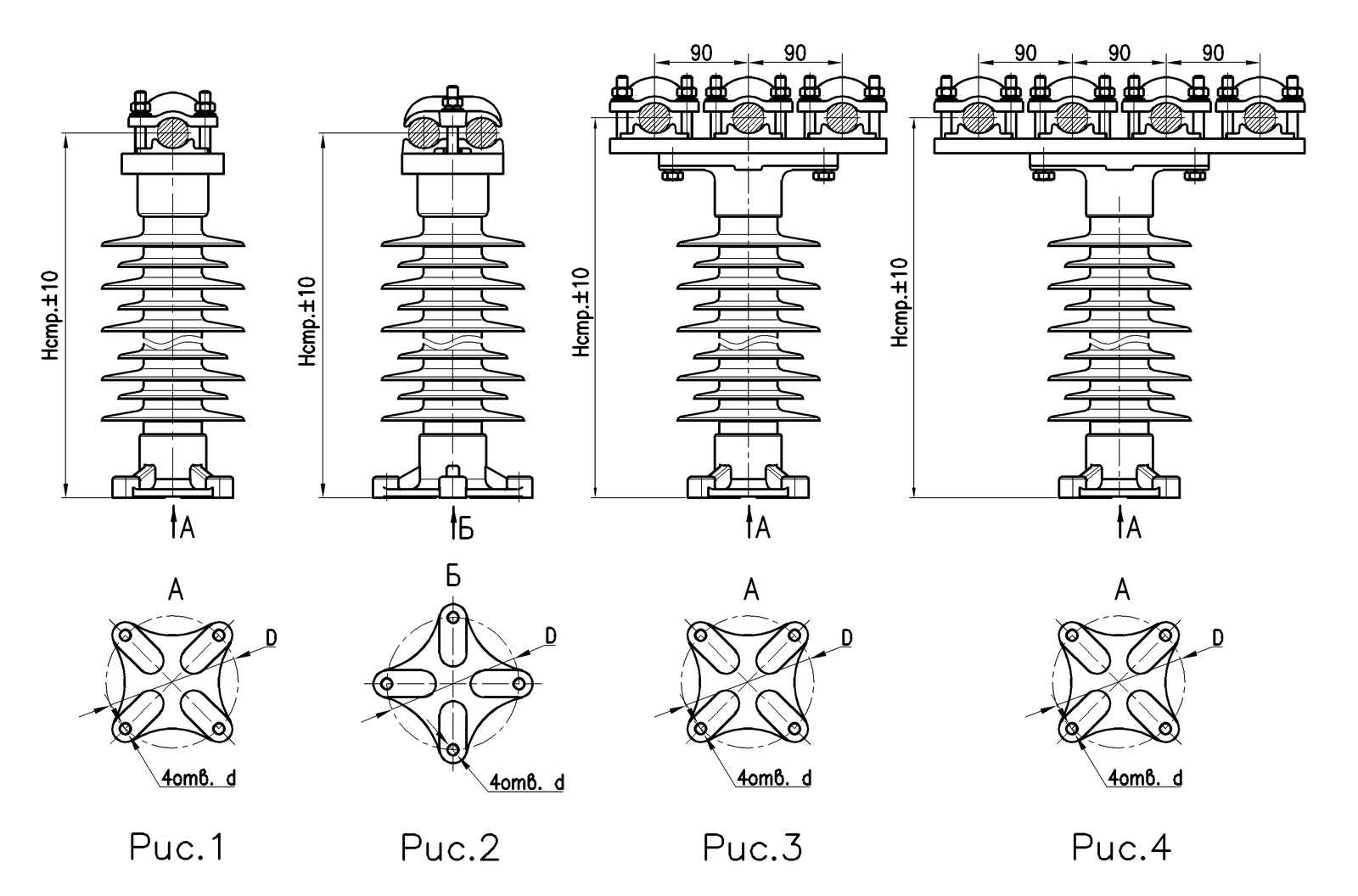 Примечание к рисункам: нижние фланцы шинных опор могут быть повернуты на 45° относительно показанных на рисунках. Такие шинные опоры обозначаются как «исполнение 1» после указания типа шинной опоры, например, "ШОСК 35-1-4-3 УХЛ1" будет иметь фланец, как на рис. 1, а "ШОСК 35-1-4-3 УХЛ1 исполнение 1" - как на рисунке 2 или "ШОСК 35-2-4-3 УХЛ1" будет иметь фланец, как на рис. 2, а "ШОСК 35-2-4-3 УХЛ1 исполнение 1" - как на рисунке 1.