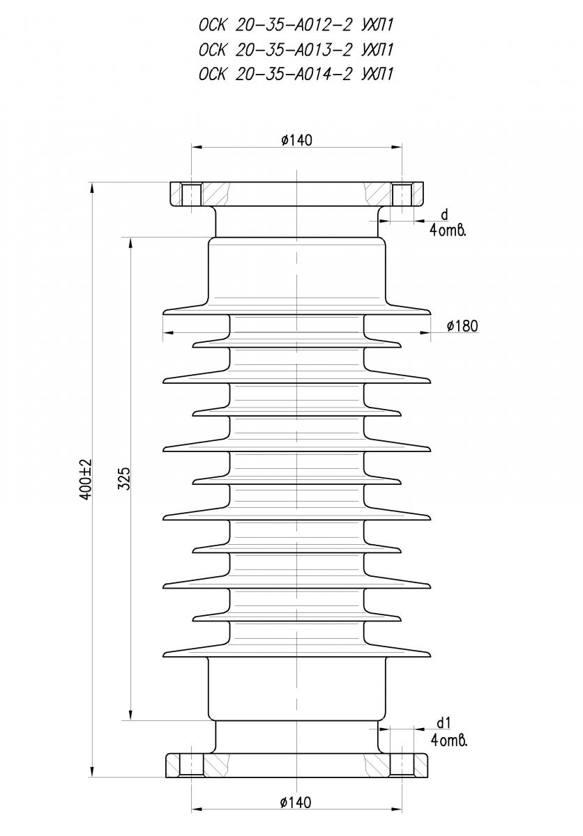 Опорные стержневые полимерные изоляторы наружной установки с кремнийорганической защитной оболочкой типа ОСК 20-35-А012-УХЛ1, ОСК 20-35-А013-2 УХЛ1, ОСК 20-35-А014-2 УХЛ1, ОСК 20-35-А016-2 УХЛ1 предназначены для изоляции и крепления токоведущих частей в электрических аппаратах, распределительных устройствах электрических станций и подстанций переменного тока напряжением до 35 кВ. В качестве элемента, воспринимающего механические нагрузки, в изоляторах используется высокопрочный стеклопластиковый стержень, соизмеримый по прочности с легированными конструкционными сталями. Отсутствие внутренней полости, в отличие от трубчатых изоляторов, исключает вероятность электрического пробоя внутри трубы, тем самым, существенно повышает надежность изолятора. Высокая гидрофобность поверхности цельнолитой защитной оболочки из кремнийорганической резины (силикона) практически в любых условиях загрязнения обеспечивает низкие токи утечки (на 1 - 2 порядка ниже, чем у фарфоровых изоляторов), что, в свою очередь, повышает разрядные характеристики и положительным образом влияет на энергосбережение. Изолятор имеет несколько модификаций по строительной высоте и размерам крепежных отверстий во фланцах. По согласованию с заказчиком возможны другие исполнения изоляторов по присоединительным размерам. Изоляторы могут использоваться в составе изоляционных колонок шинных опор на напряжения 110, 150 и 220 кВ без использования дополнительной экранной арматуры, и на напряжение 330 кВ с использованием соответствующей экранной арматуры. Изоляторы являются аналогами по назначению, присоединительным размерам и техническим характеристикам фарфоровых изоляторов типа ОНШ 35-1000 УХЛ1 и ОНШ 35-2000 УХЛ1, широко используемыми ранее для формирования изоляционных колонок на напряжения от 110 до 330 кВ. В большинстве случаев, НПО Изолятор рекомендует на напряжения 110, 150, и 220 кВ использовать не составные, а цельные изоляторы типа ОСК 110, ОСК 150 и ОСК 220 кВ, являющиеся более надежными механически и электрически, поскольку не имеют промежуточных соединительных элементов (фланцев), снижающих электрическую прочность составной колонки.